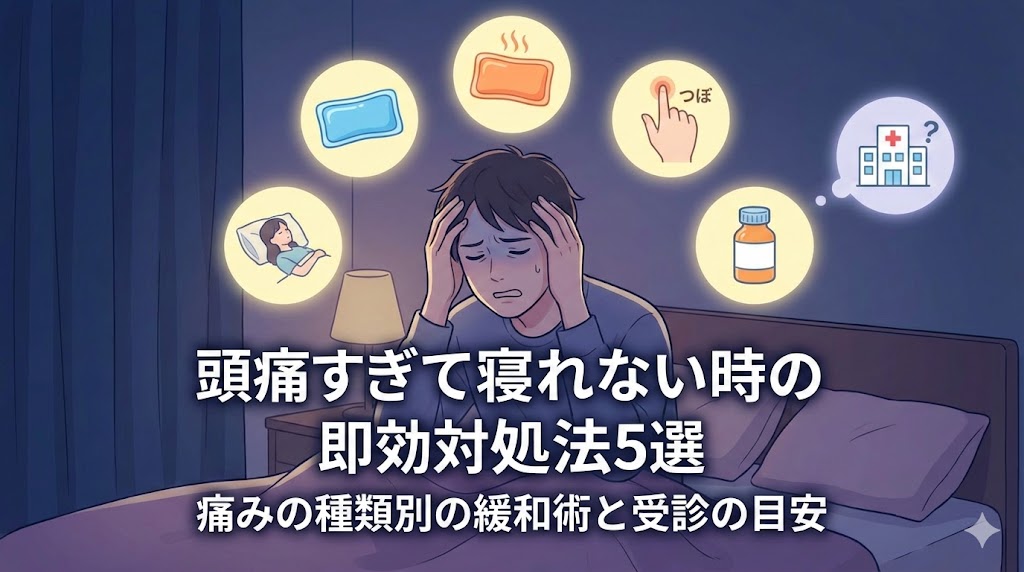 頭痛すぎて寝れない夜、今すぐ痛みを和らげるための対処法を解説します。冷やす・温めるの正しい判断基準や、寝る姿勢の工夫、効果的なツボを紹介。また、命に関わる危険な頭痛のサインも掲載しているため、自分の症状が受診すべきものかすぐにチェックで... -