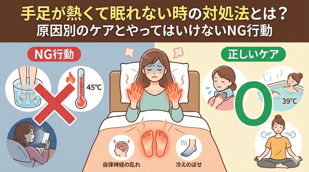 手足が熱くて眠れない対処法を探している方へ。夜中に手足がほてり寝付けない原因は、自律神経の乱れや「冷えのぼせ」かもしれません。この記事では、今すぐ熱さを和らげる正しいケアから、実は逆効果なNG行動、受診すべき病気のサインまで専門的な視点で... -