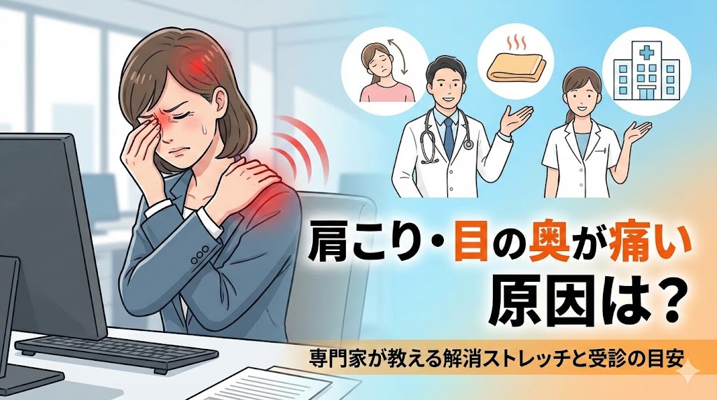 肩こりと目の奥が痛い症状にお悩みの方へ。その原因は眼精疲労や自律神経の乱れ、筋肉の緊張かもしれません。本記事では、今すぐ試せる解消ストレッチやツボ、注意すべき重大な病気のサインを解説します。放置せず、適切なケアで辛い痛みをスッキリ解消し... -