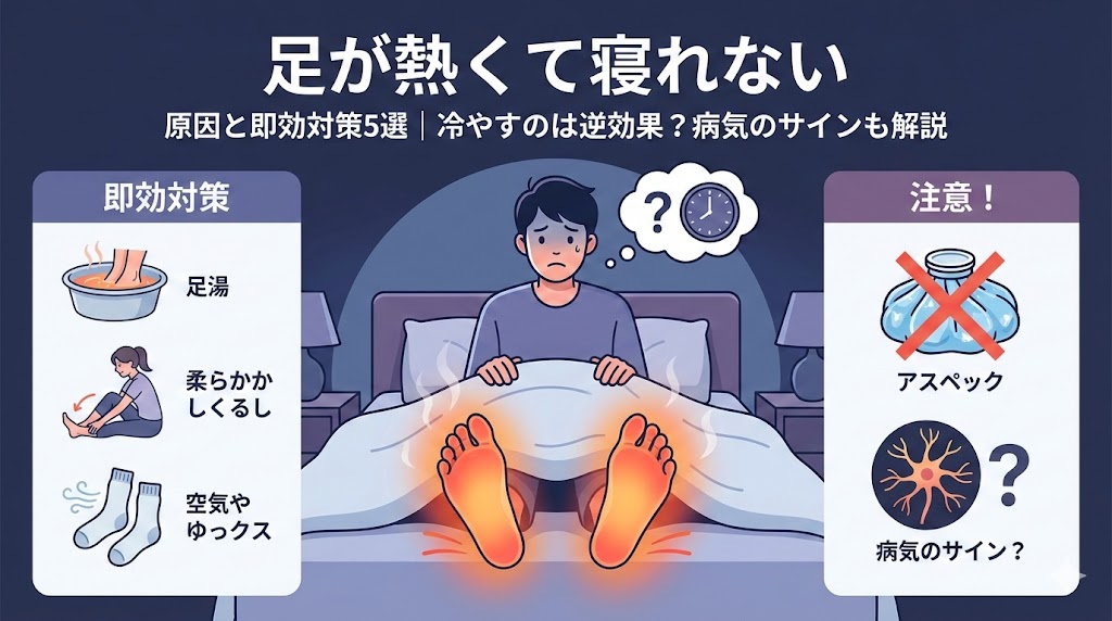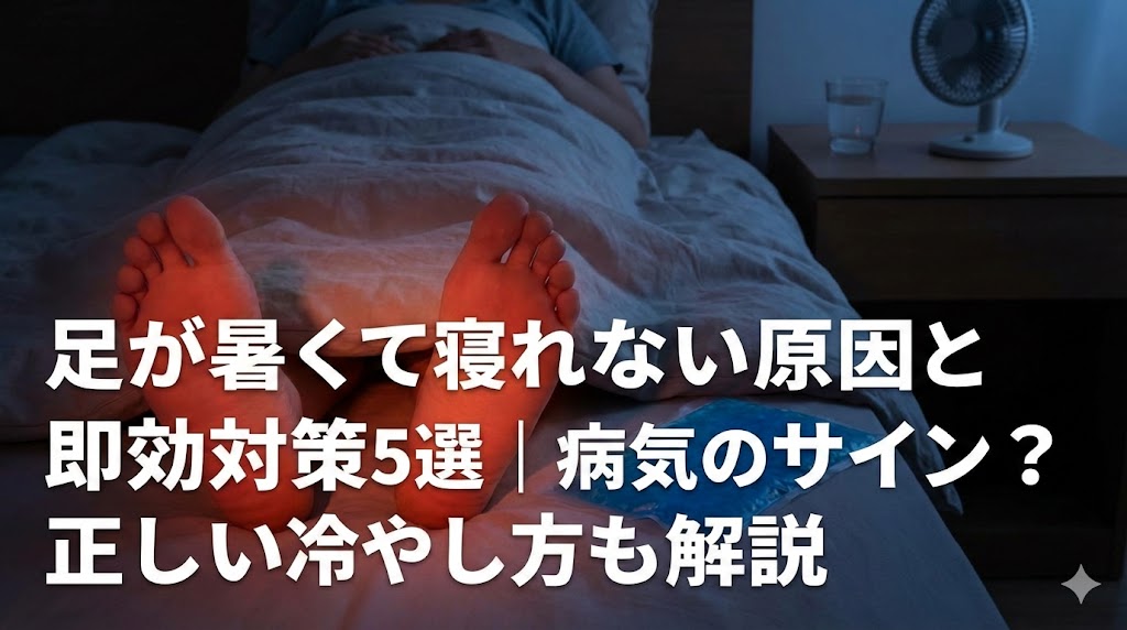 足が熱くて寝れない原因は、自律神経の乱れや「バーニングフィート症候群」かもしれません。この記事では、今すぐ試せる熱さ解消法や、やってはいけないNG対処法、注意すべき病気のサインを詳しく解説します。辛い足の熱さを解消して、朝までぐっすり眠る... -