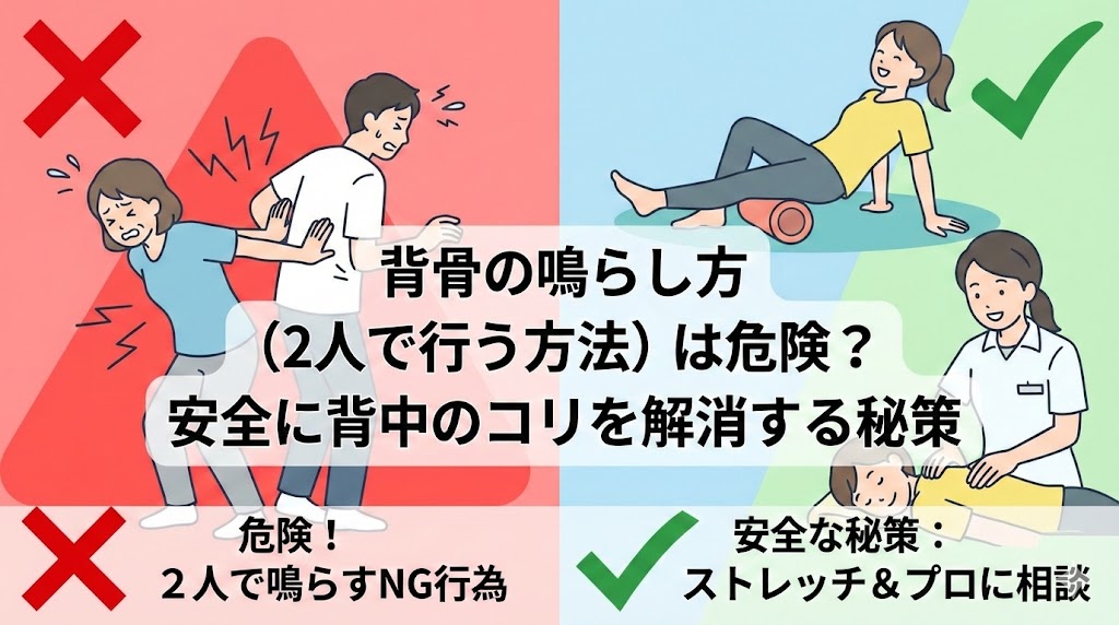 背骨の鳴らし方を2人で探している方へ。友だちや家族に背中を押してもらう行為には、実は重大な神経損傷のリスクが潜んでいます。本記事では、なぜ2人で鳴らすのが危険なのか、その理由とプロが推奨する安全なセルフストレッチ、解消法を詳しく解説します... -