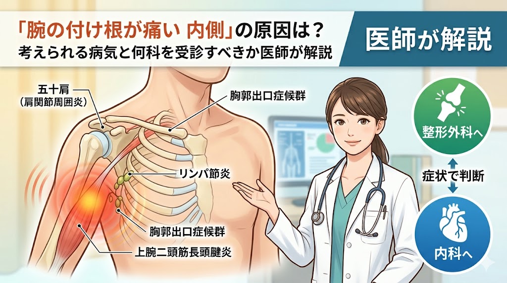 腕の付け根が痛い、内側がズキズキする原因は何?五十肩や胸郭出口症候群などの可能性から、リンパの腫れによる内科的疾患まで詳しく解説します。整形外科と内科どちらに行くべきかの判断基準や、自宅でできるストレッチも紹介。長引く痛みを解消するヒン... -