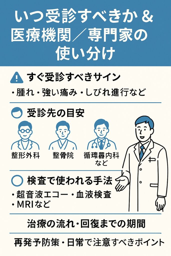 受診の際は「どこに行けばいいのか」が気になるポイントです。筋肉や靭帯の損傷が疑われる場合は整形外科、慢性的な張りやバランスの崩れがあるなら整骨院、血管の病気を疑うときは循環器内科が参考になるとされています。痛みの性質や状況に応じて専門家を選ぶことが推奨されています。