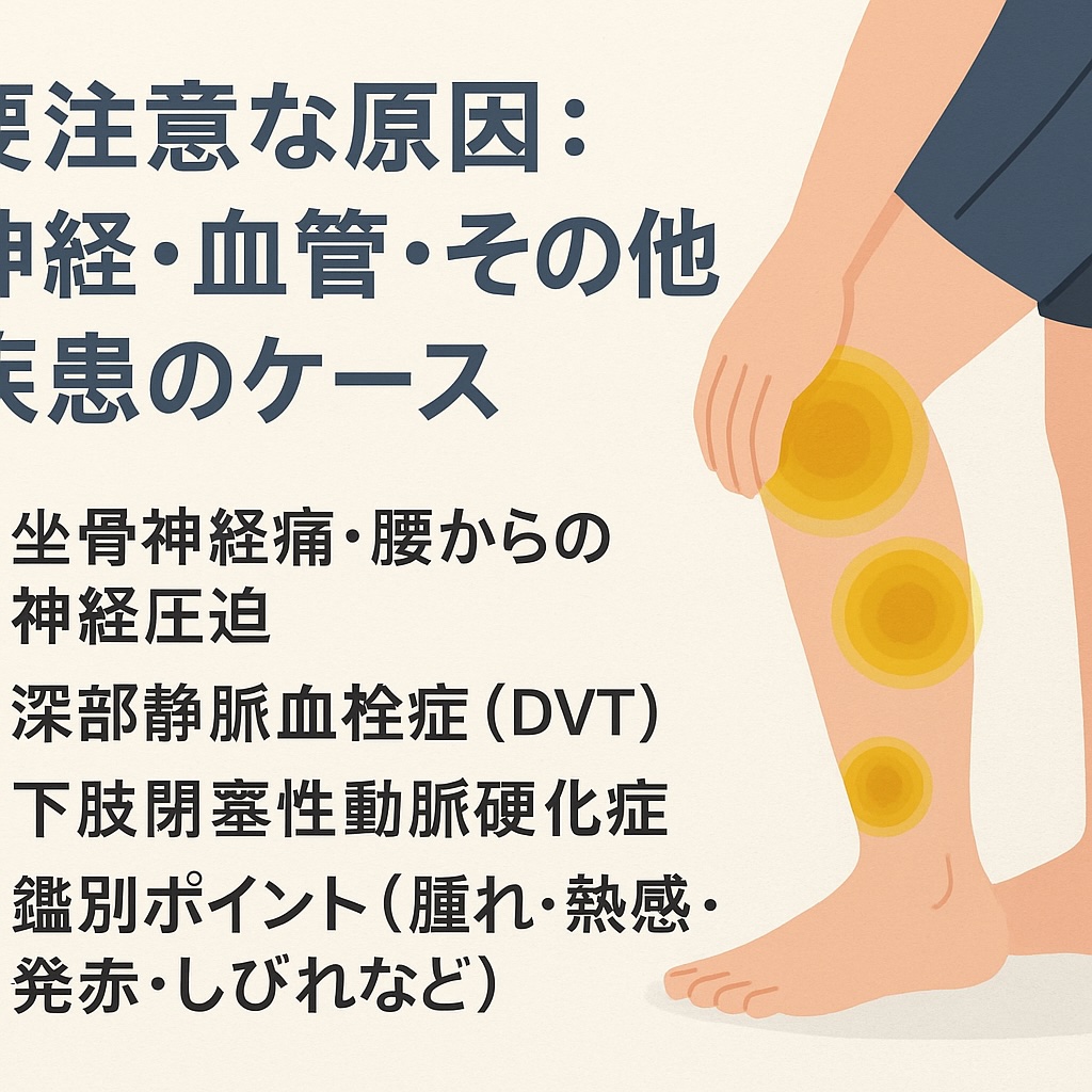 ふくらはぎの痛みが軽度であれば様子を見てもよいケースがありますが、以下のような症状が出ているときは注意が必要だと言われています。例えば「片足だけが急に腫れる」「強い痛みが続く」「しびれが進行する」などです。これらは血管や神経に関連する疾患の可能性もあり、放置するとリスクが高まると指摘されています(引用元:ubie.appnaorusalon.commeguro-geka.jp)。