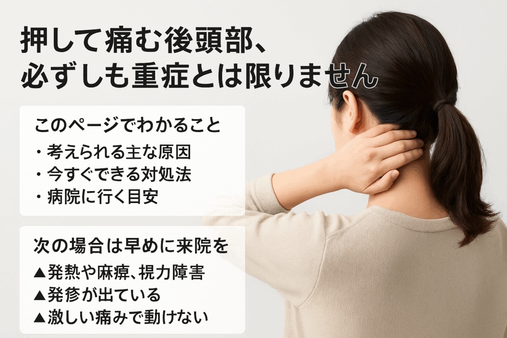 後頭部 押すと痛い と感じる原因は首こり・後頭神経痛・しこり(粉瘤など)・帯状疱疹やまれに血管性疾患など多岐に渡ります。本記事は押すと痛む場所のセルフチェック方法、緊急性の見分け方、即効で試せるセルフケアと病院での検査・治療方針を分かりやすく解説します。