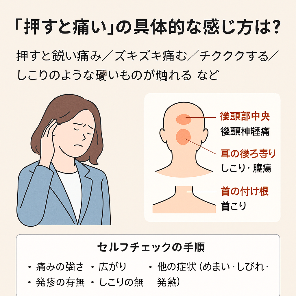 後頭部を押したときに「ズキッと鋭い痛み」「ジワジワ広がるような鈍い痛み」「チクチクと刺すような感覚」「触れるとしこりのような硬い部分がある」と感じることがあります。これらは一見すると似ていますが、原因によって特徴が違うと言われています。
