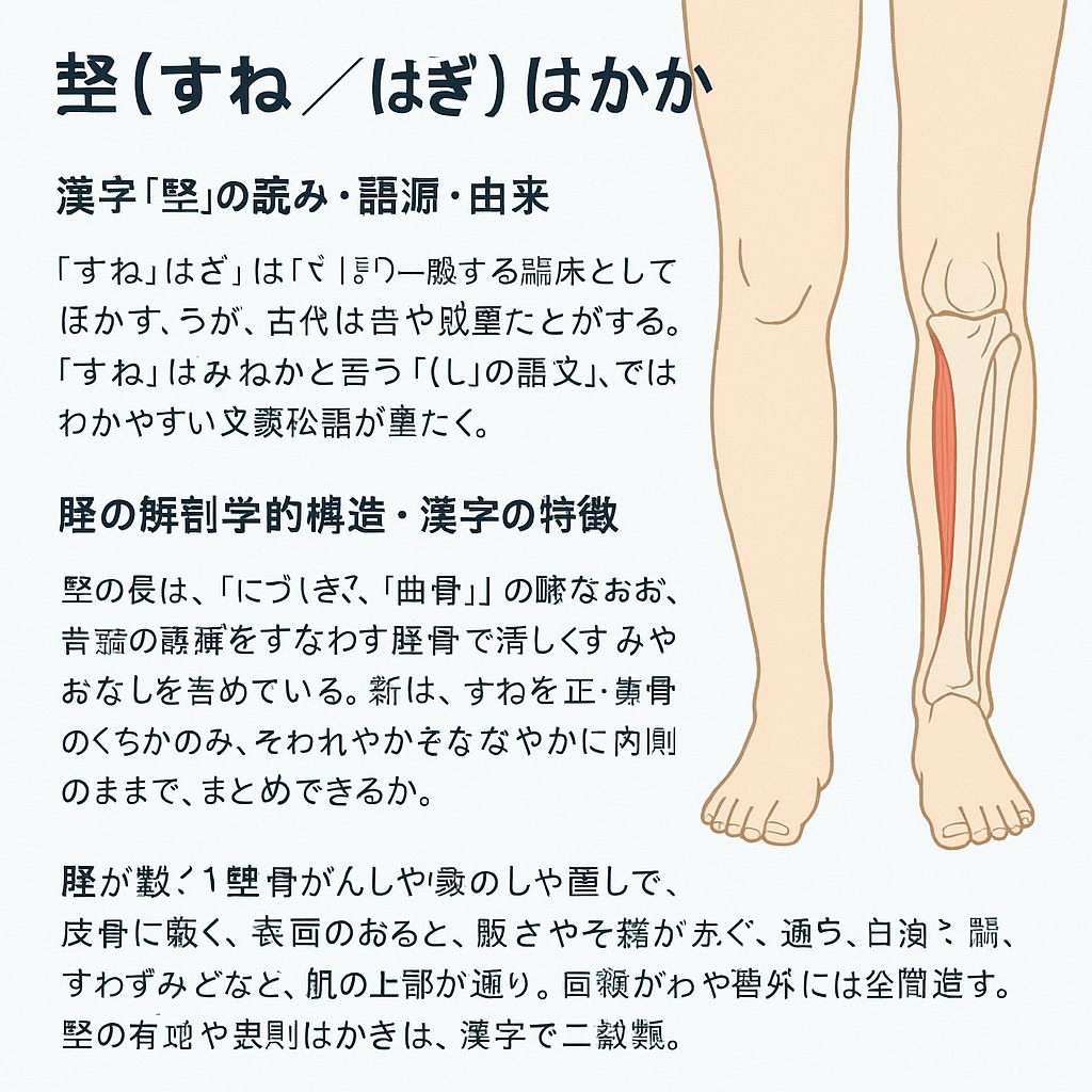 脛とは、膝から足首までの部位「すね/はぎ」の漢字表記としての意味や読み方、構造、痛みの原因と対策を詳しく解説。脛の痛みで悩む人にも、漢字・語源に興味がある人にも役立つ内容満載です。