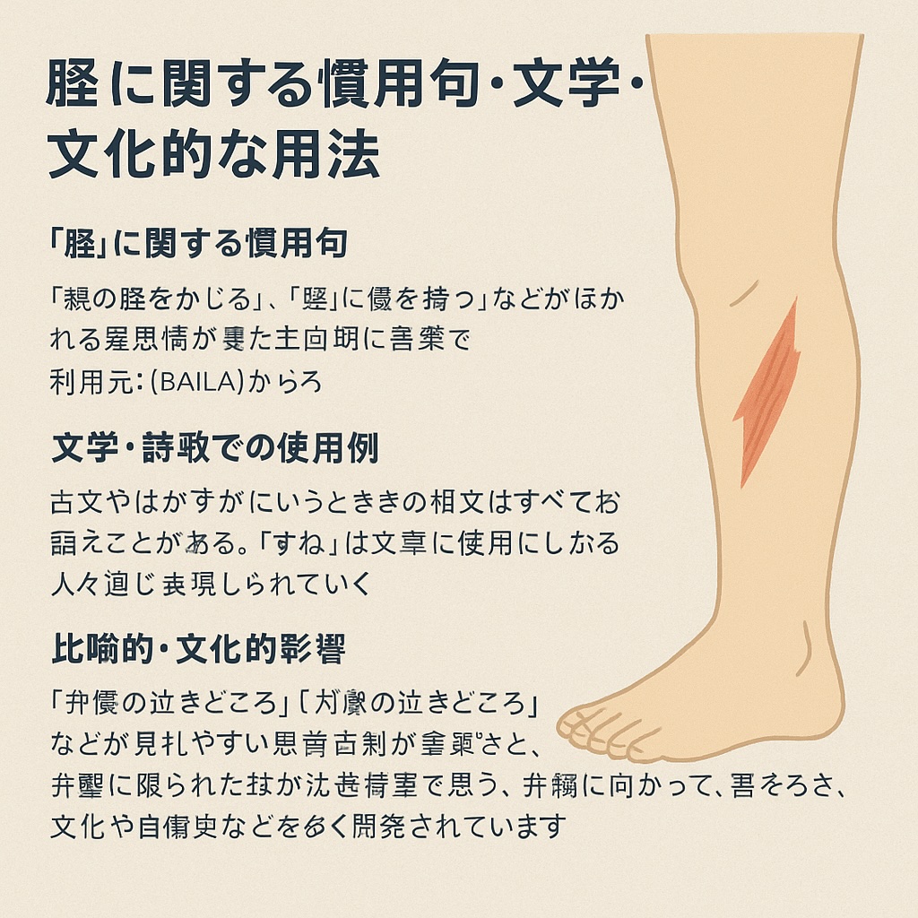 古典文学や和歌の中でも「すね」「はぎ」という言葉は登場しています。万葉集では「はぎ」として脚部を詠んだ歌が見られ、時代を超えて体の一部を象徴的に描写する役割を果たしてきたと考えられています。また、現代小説や詩の中でも「すねの細さ」や「脛の痛み」といった描写は、人間の弱さや生活の一場面を表現する手段として使われることがあるようです。