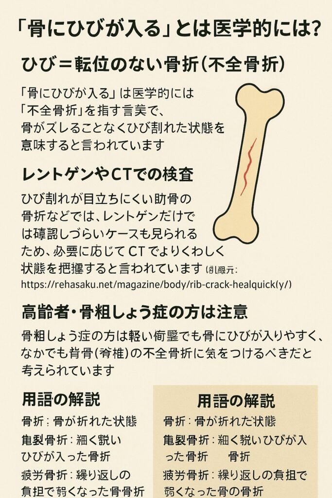 一般的に「骨にひびが入る」と言われる状態は、医学的には「不全骨折」と呼ばれています。これは骨が完全に折れているわけではなく、ズレ(転位)がないまま細かい亀裂が入った状態を指すと言われています。完全骨折と比べて見た目では分かりにくく、痛みの程度も個人差があるのが特徴です。