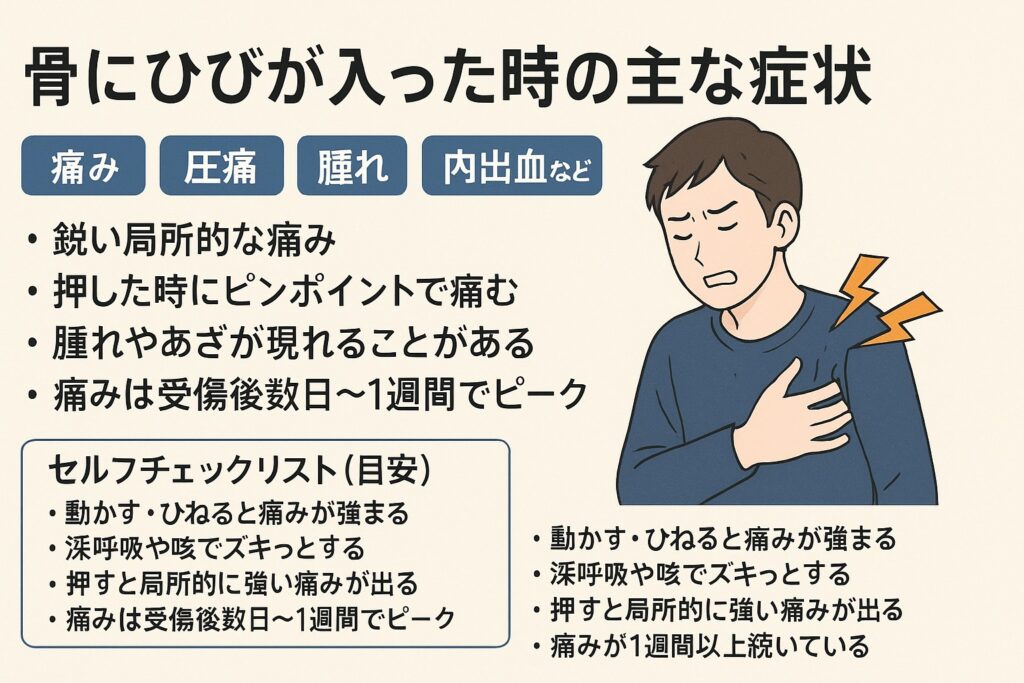 骨にひびが入った場合、多くの人がまず「鋭い局所的な痛み」を訴えると言われています。特に動かした時に強くなったり、咳や深呼吸をした時にズキっと響くような感覚が特徴です。肋骨にひびが入った場合は、呼吸のたびに痛みが増すとされており、日常生活に支障を感じるケースも少なくありません。