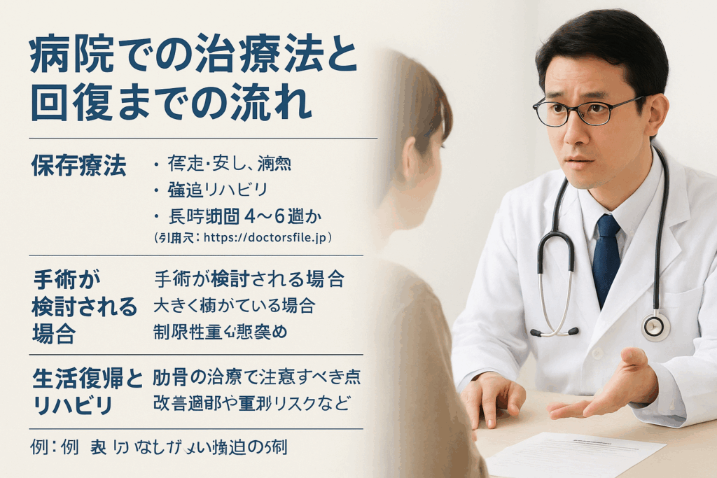 骨にひびが入った場合、多くは保存療法と呼ばれる方法で対応すると言われています。内容は安静を保つこと、患部を固定すること、痛みに対して鎮痛薬を使うこと、そして肋骨などでは呼吸が浅くならないようにリハビリを取り入れることが含まれています。改善までの期間はおおむね4〜6週間が一つの目安と説明されることが多いようです。