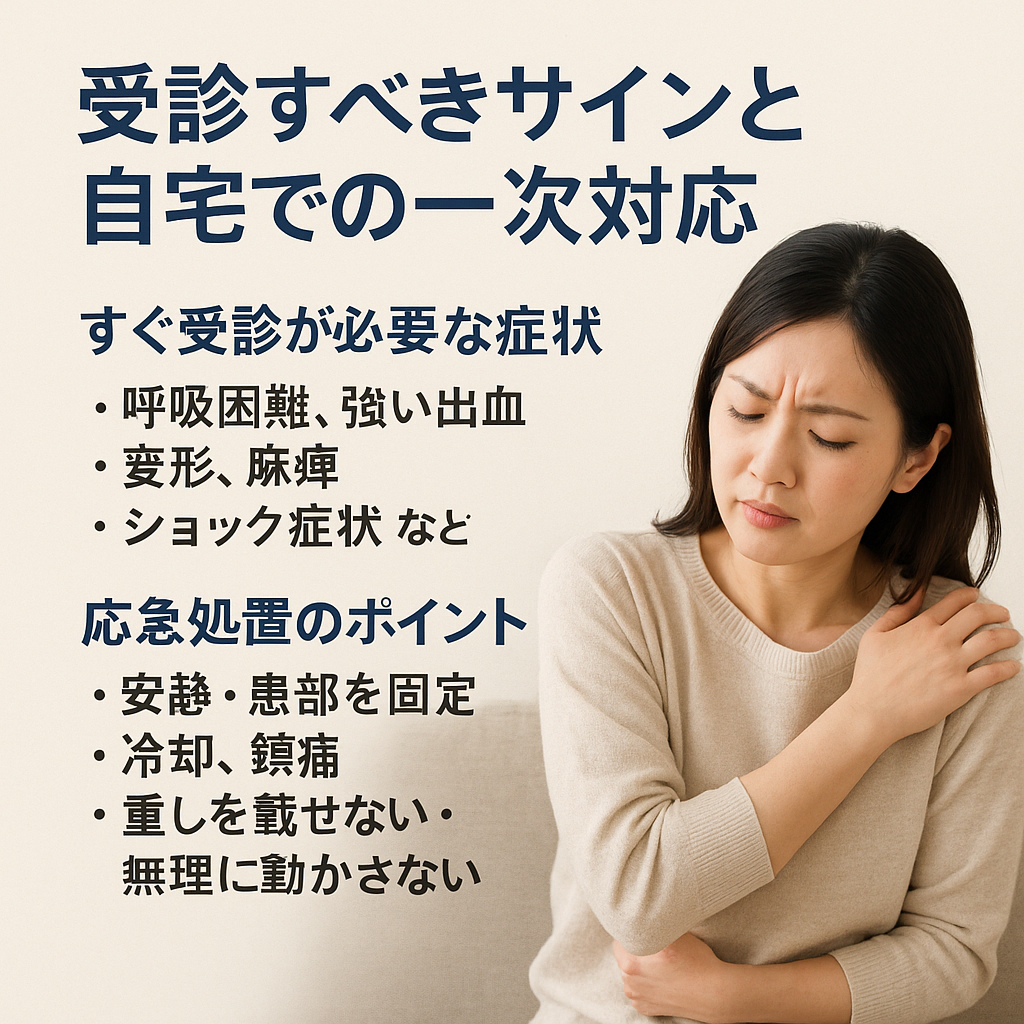 来院までの間にできることとしては、まず安静を保つことが大切だとされています。動かさずに患部を固定し、痛みが強い場合には冷却で一時的に症状を和らげる方法が紹介されています。市販の鎮痛薬についても、使用前に体調や持病との兼ね合いを考える必要があると言われています。