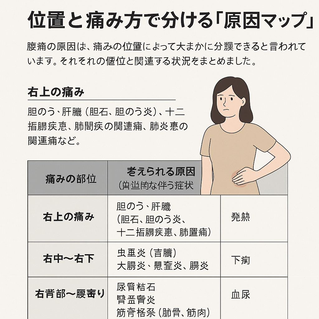 右脇腹 痛み 女性 — 右上/右下/背中寄りの違いで疑う疾患(胆石・腎盂腎炎・卵巣関連など)を図解で分かりやすく解説。痛みの性質別のセルフチェックと「今すぐ受診すべき赤旗症状」も提示します。