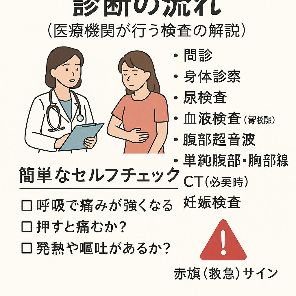 自宅でできる簡単なセルフチェックとしては、「呼吸をすると痛みが強まるか」「お腹を押すと特定の場所で痛むか」「発熱や吐き気があるか」などが挙げられます。こうした確認を通じて、ある程度の手がかりをつかめることもありますが、自己判断だけで放置するのは危険だとされています。特に、強い痛みが急に出た、血尿がある、顔や皮膚が黄色っぽくなる、意識がもうろうとする、といった症状がある場合は「赤旗(救急)」のサインとされ、早急に医療機関への連絡がすすめられています。