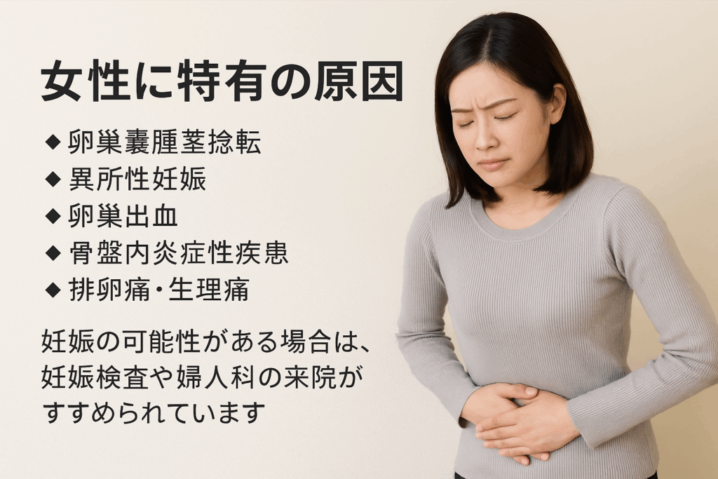 右脇腹の痛みは消化器や泌尿器に限らず、女性特有の器官とも関係する場合があると言われています。代表的なのが卵巣嚢腫の茎捻転で、卵巣がねじれることで急に強烈な痛みが出るのが特徴とされ、婦人科系の緊急性が最も高いケースのひとつと指摘されています。また、妊娠に関係する症状としては、異所性妊娠(子宮外妊娠)があり、これは卵管内で受精卵が成長することによって強い腹痛や出血を伴うとされています。卵巣出血や骨盤内炎症性疾患(PID)も痛みの原因として挙げられ、発熱や下腹部の圧痛、さらには性交後の出血が合併することもあると報告されています。