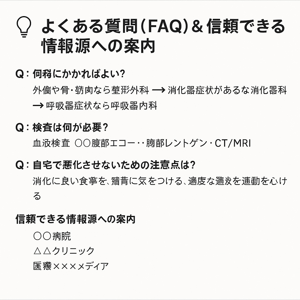 - すぐ救急へ:呼吸困難、激しい持続的な痛み、意識がもうろうとする、止まらない嘔吐や黒色便、胸の圧迫感。