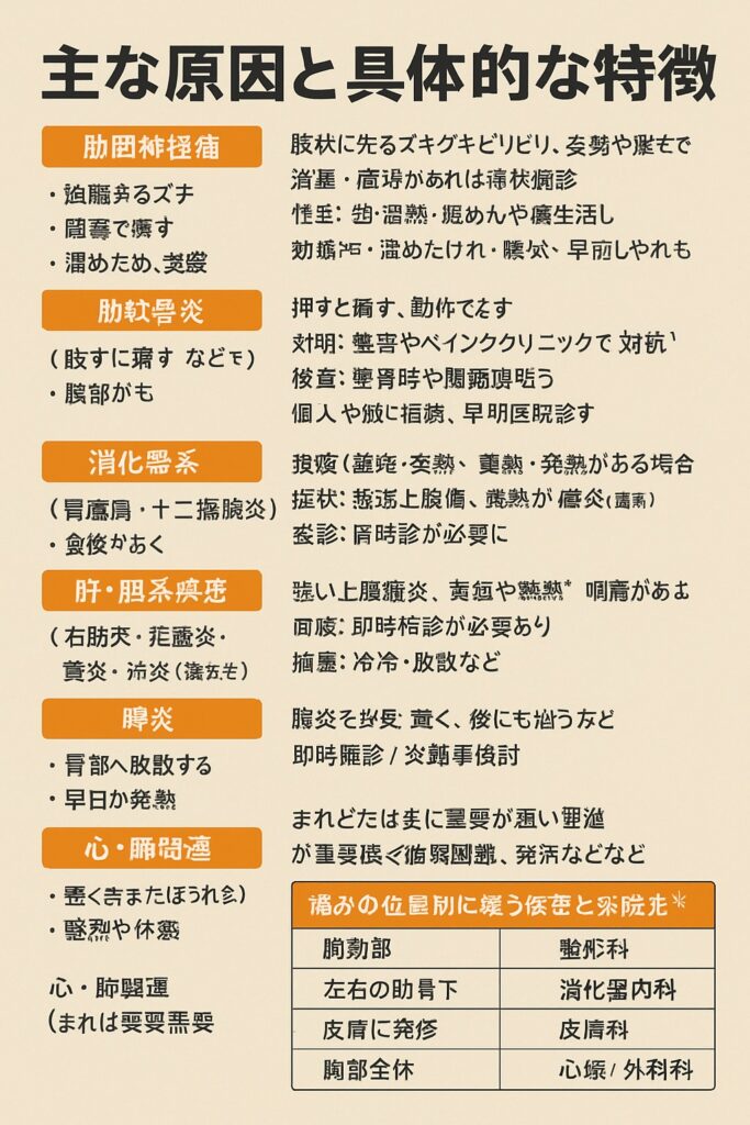 押すと痛みが増すことが多く、動作や深呼吸で強まるのが典型的とされています。原因は咳や繰り返しの動作による負担が多いそうです。整形外科やペインクリニックで確認され、画像検査や触診で判断されることがあります。自宅では安静や温熱で改善を図ることが一般的といわれています。