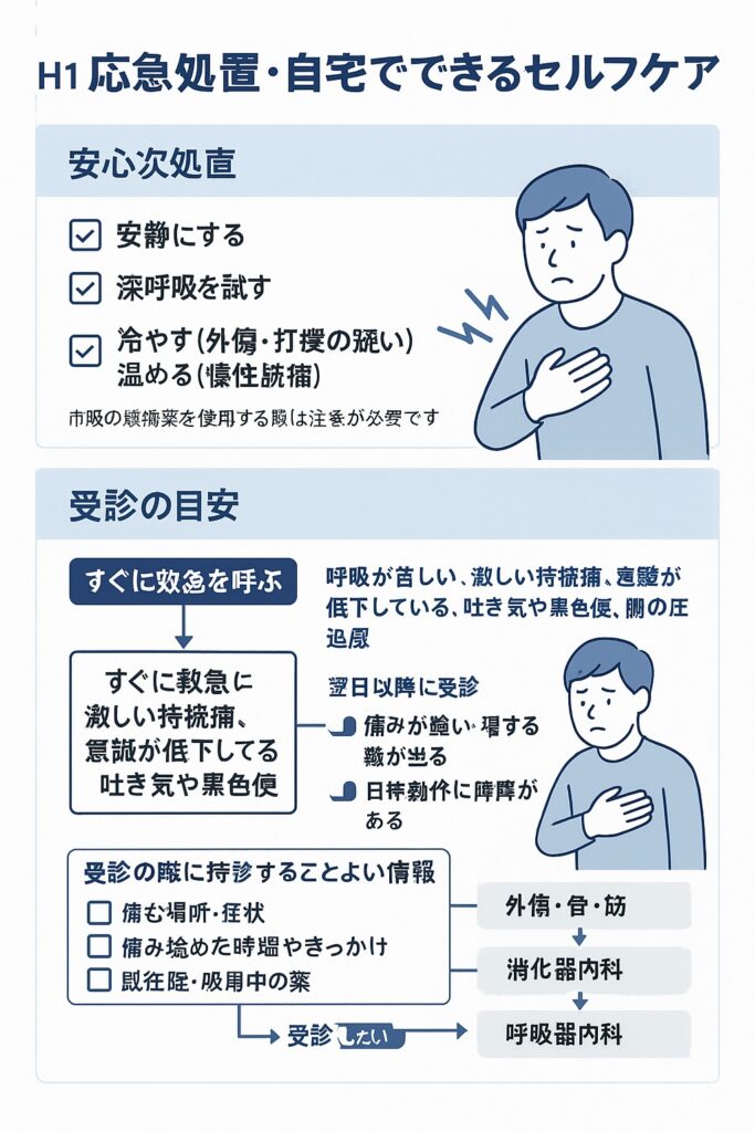 - 痛みが強く不安なときは早めに医療機関へ相談する