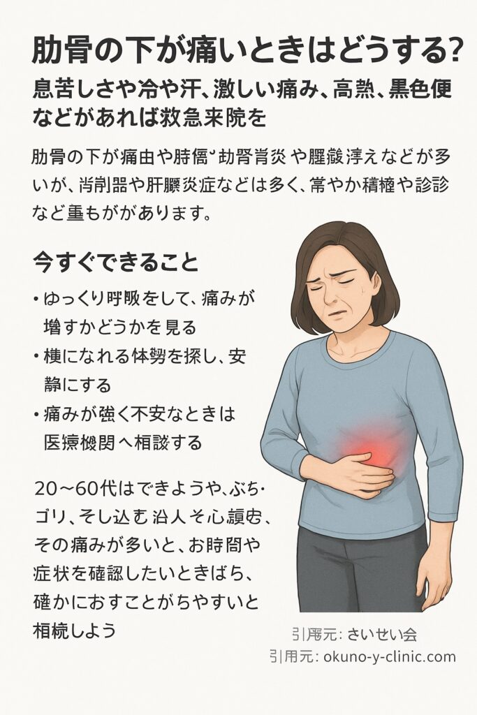 肋骨の下が痛いと感じたときの原因(肋間神経痛・肋軟骨炎・消化器疾患など)の見分け方、応急処置、受診すべき科と緊急サインをわかりやすく解説します。