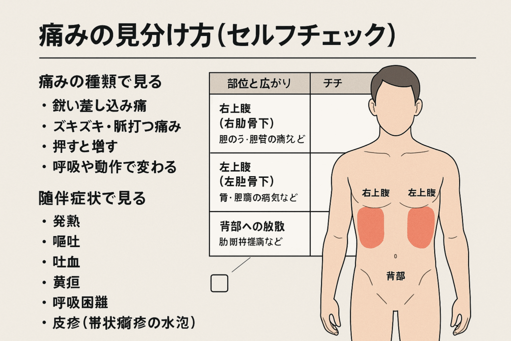 痛みの場所によっても目安が変わります。右上腹(右肋骨下)に限られる場合は胆石や胆のう炎、肝臓のトラブルが候補に挙げられることが多いです。左上腹(左肋骨下)の痛みなら胃や膵臓の不調が関わると言われています。また、背中にまで放散する場合は膵炎や腎臓関連のサインとして注意が必要です。