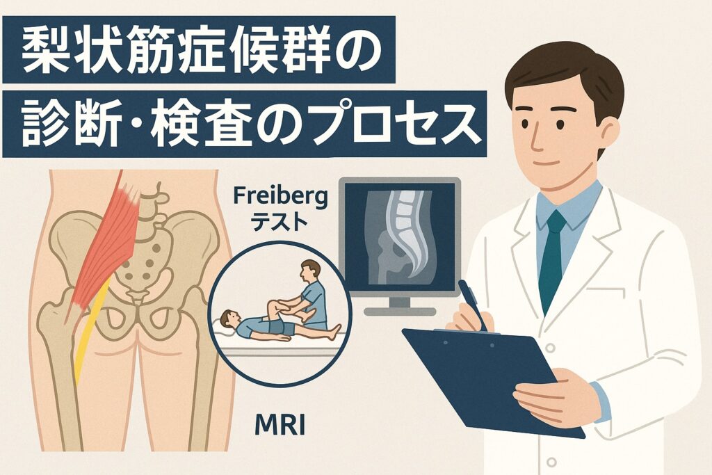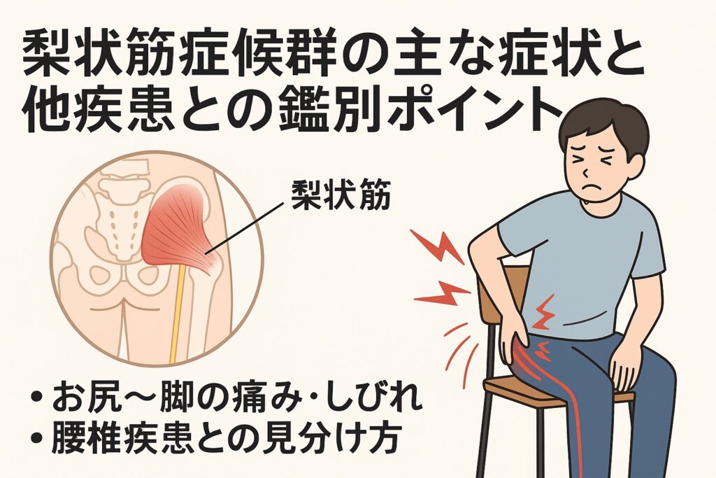 鑑別すべき疾患としては、腰椎椎間板ヘルニア、脊柱管狭窄症、梨状筋以外の深臀部筋障害(内閉鎖筋・双子筋群など)、静脈血栓症、可動性異常(骨盤アライメント不良)などが挙げられます。これらを問診・検査・画像所見で除外していくのが診断プロセスの要点だと言われています。(@0search12, @0search20)
