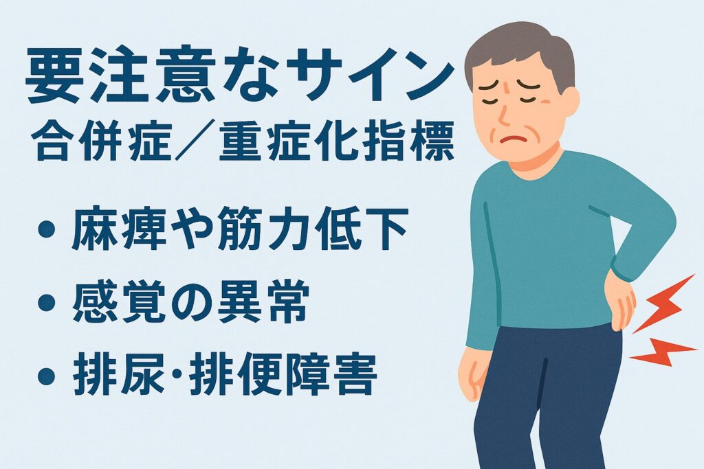 3つ目は、排尿・排便障害です。残尿感がある、尿が出にくい、あるいは便秘や失禁が続く場合、腰の神経が強く圧迫されているサインと考えられています。これらは「馬尾(ばび)神経障害」と呼ばれ、早急な対応が必要とされることが多いそうです(引用元:https://www.joa.or.jp/public/sick/condition/sciatica.html)。