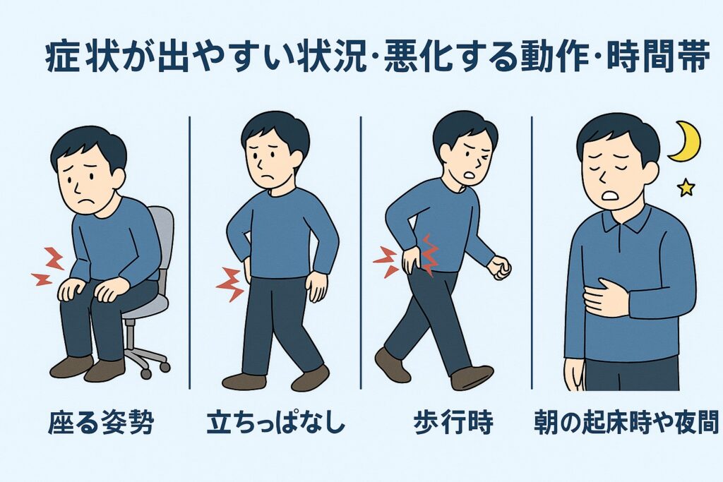 坐骨神経痛の症状は「常に同じように痛む」わけではなく、特定の姿勢や動作、時間帯によって強く感じることがあると言われています。たとえば「座っているときだけズキズキする」「朝起きた直後がつらい」「歩き始めに足がしびれる」といった声は多く聞かれます。これは、神経への圧力や血流の状態が姿勢によって変わるためだと考えられています(引用元:https://www.mediaid-online.jp/clinic_notes/information/1584/)。