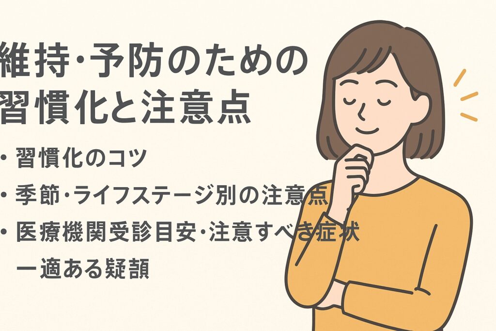 「せっかく冷えを改善したのに、また冷えるようになってしまった…」という声、よく聞きます。だからこそ、一度よくなっても戻さないように、日常での習慣化がとても大切です。ここでは、長く続けられる工夫と注意点を交えながら解説していきます。