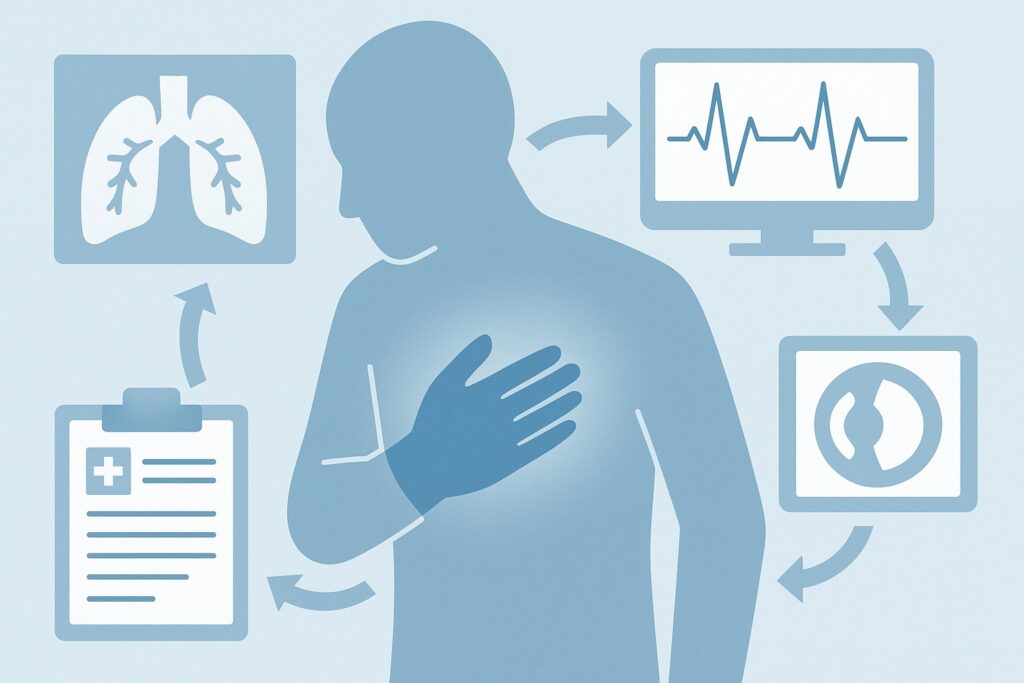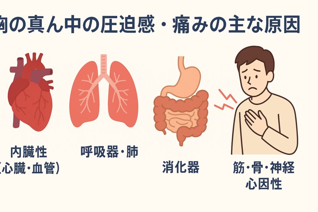 「胸の真ん中あたりが圧迫されるような感じ」には、原因が一つではなく複数の領域にまたがる可能性があります。ここでは大きく 内臓性(心臓・血管)/呼吸器・肺/消化器/筋・骨・神経/心因性 の5つのカテゴリに分け、それぞれ代表的な疾患を紹介します。