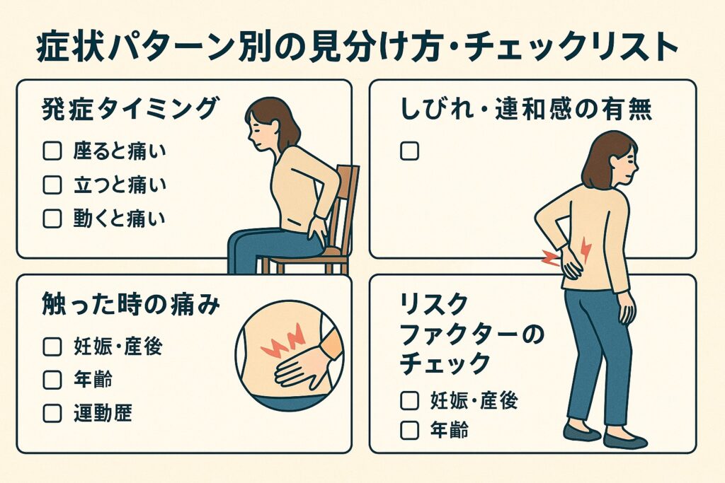 「なんだか痛いけど、どのタイプだろう…?」と感じるなら、自分で確認できる“見分けのヒント”があると安心ですよね。ここでは、発症タイミング・触診での痛み・しびれや違和感の有無・リスク要因を軸に、自分の痛みを把握するチェックリスト形式で見ていきましょう。