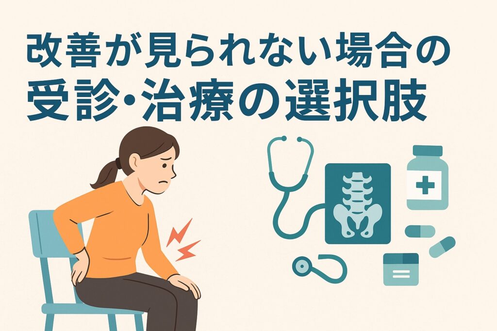このように、自己流ケアでは対応しづらいケースに対しては、受診基準・診療先・検査・治療オプション・リハビリを明確に示すことで、読者に安心感と方向性を提供できます。