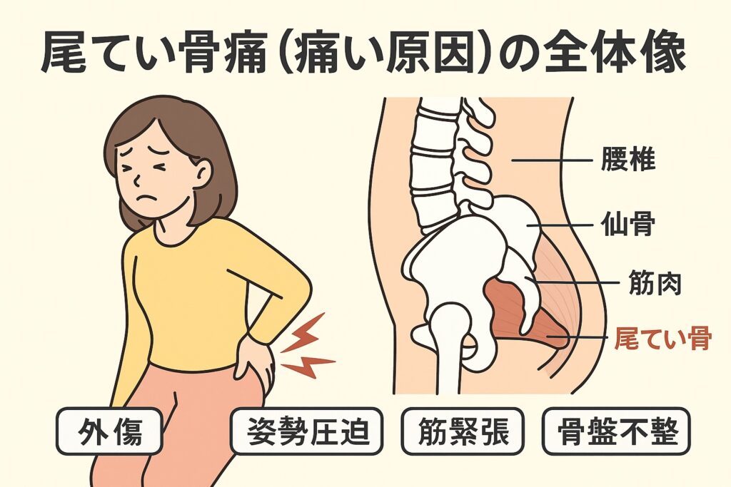 尾てい骨痛が起こる原因は一つではなく、複数のパターンが絡み合っていることも多いです。ここでは代表的なものを分類してみます。