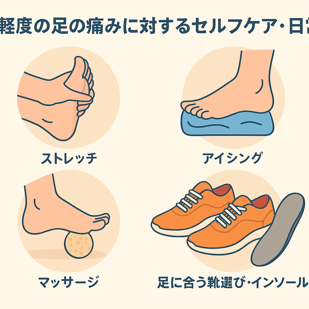 「ちょっと痛むけど病院には行きたくない…」というとき、まず自分でできるケアを取り入れることで痛みの進行を抑えられることもあります。ここではストレッチ・アイシング・マッサージ・靴選び・インソール活用という5つの方法を取り上げ、それぞれのやり方・注意点・継続のコツを会話風に解説します。ただし、痛みが強い・長引く場合は専門家の助言を受けてくださいね。