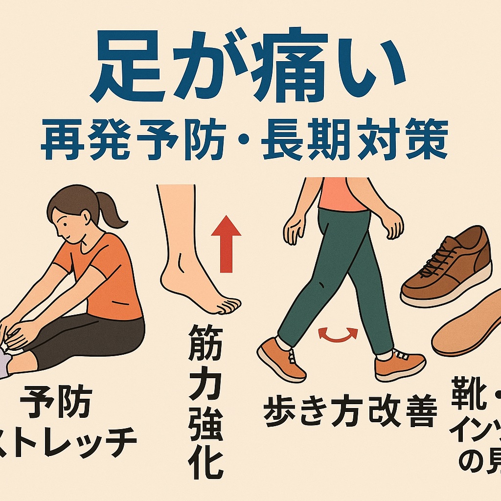 「痛みが一時的に楽になったから安心」というのは危険な思い込みになりがちです。足の痛みを再発させないよう、日常的にできる対策を段階的に取り入れていくことが重要です。ここでは、予防ストレッチ・筋力強化・歩き方改善・靴・インソールの見直し・生活習慣という5つの柱を軸に、実践例・注意点・ステップを交えて解説していきます。