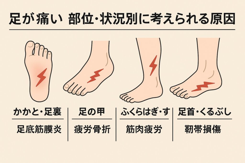 足が痛いと感じると、「どこが・いつ痛むか」によって原因の見当がつきやすくなります。ここでは、かかと・足裏/足の甲/ふくらはぎ・すね/足首・くるぶしという部位ごとに、よく見られる疾患と「痛みが出やすい状況」をまとめます。
