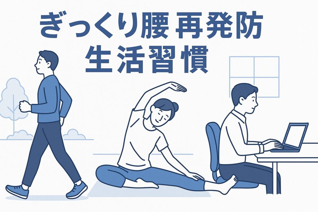 習慣として「毎時間1回、立ち上がって軽くストレッチ」や「座る時は浅めに腰掛け、足裏を床につける」などを取り入れておくと、再発防止に効果的です。