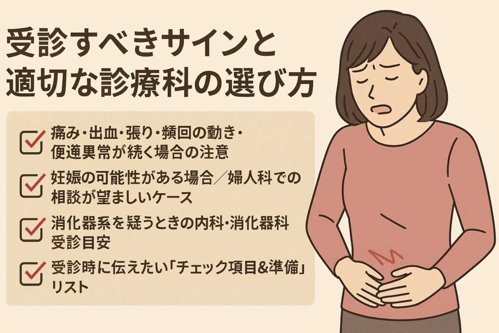 「下腹部がポコポコ動く」感覚は多くの場合、腸の動きやガスによる一時的な現象ですが、症状が続く・痛みや出血を伴うなどの場合は、専門の医療機関に相談することがすすめられています。ここでは、来院の目安と、どの診療科に相談すべきかをわかりやすく整理しました。