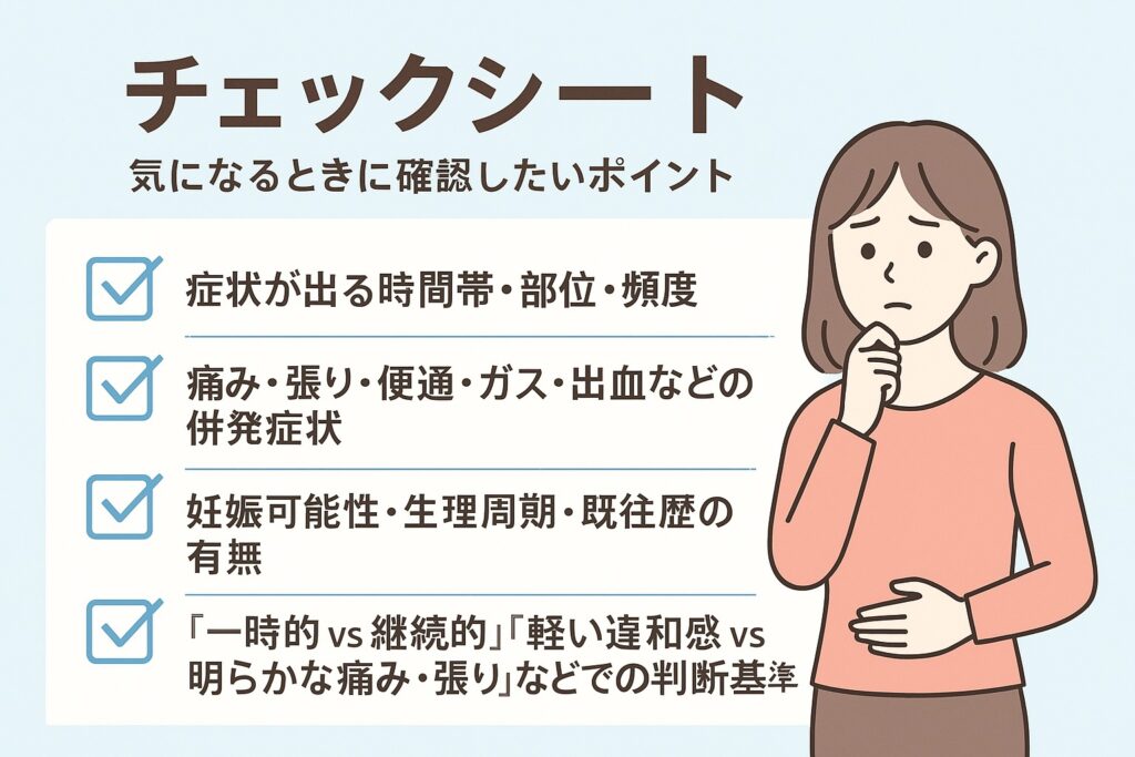 「下腹部がポコポコ動くけど大丈夫かな?」と感じたとき、焦って原因を決めつけるよりも、まずは自分の状態を整理してみることが大切です。ここでは、来院や相談の目安になる“セルフチェック項目”を紹介します。簡単なメモを取っておくだけでも、後で医師や専門家に説明しやすくなると言われています。