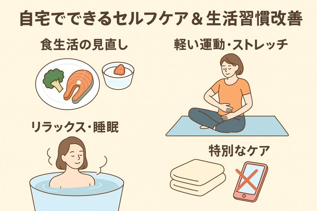「下腹部がポコポコ動く」ような感覚が気になるとき、生活習慣を少し見直すだけで改善が期待できるケースもあると言われています。ここでは、腸の動きを整え、自律神経を安定させるために自宅でできる簡単なケアを紹介します。