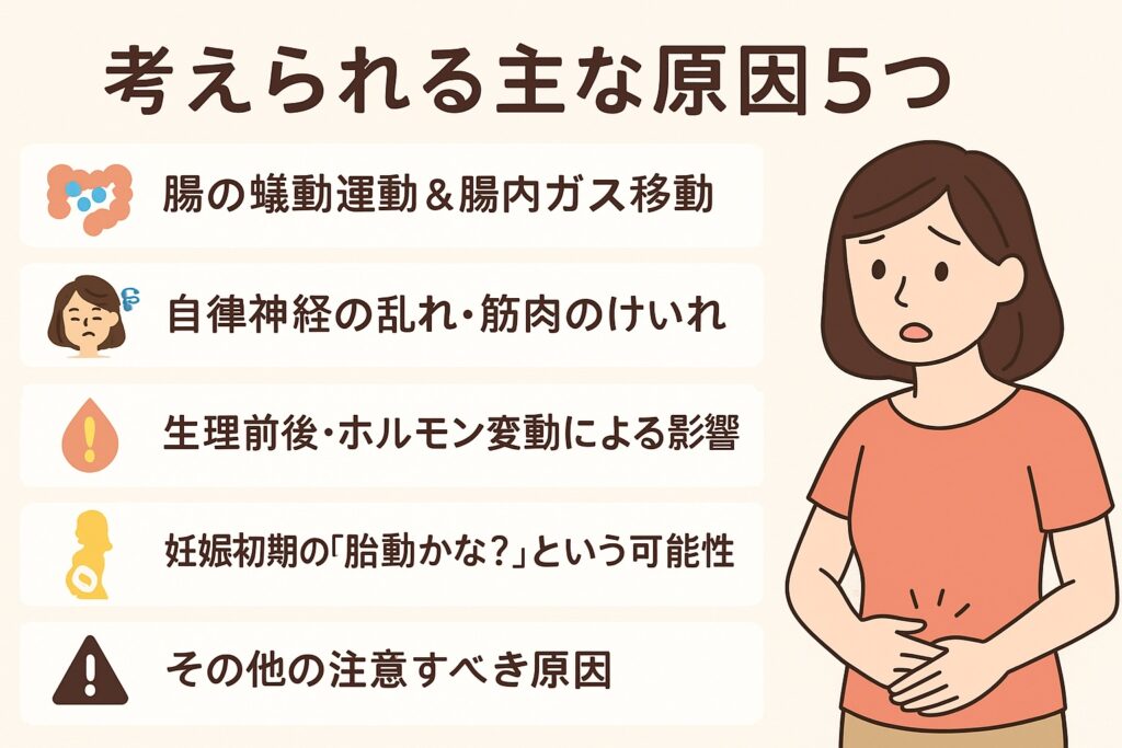 下腹部が「ポコポコ動く」と感じる原因は一つではありません。多くは腸の動きに関連していますが、ホルモンバランスや自律神経、妊娠、さらには病気のサインであることもあると言われています。ここでは代表的な5つの要因を、わかりやすく紹介します。