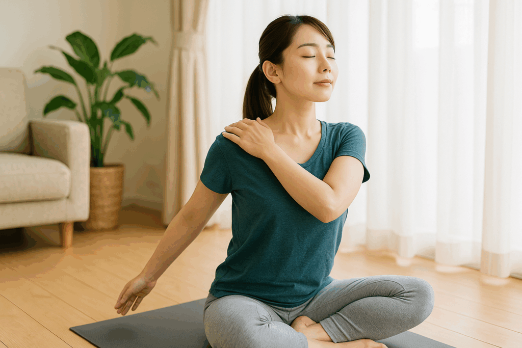 肩こり改善ヨガでガチガチ肩をリセット!デスクワーク・スマホ操作で硬まった首・肩まわりを、初心者でも安心して取り組める5つのポーズ+日常習慣チェックでスッキリ軽やかに変える方法を解説します。