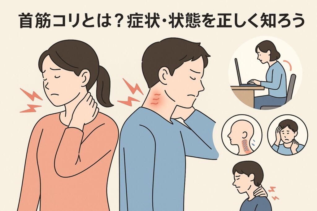 首筋コリとは、首の後ろから側面にかけてある筋肉が緊張し、血行が悪くなることで“硬くこわばる”状態を指すと言われています。