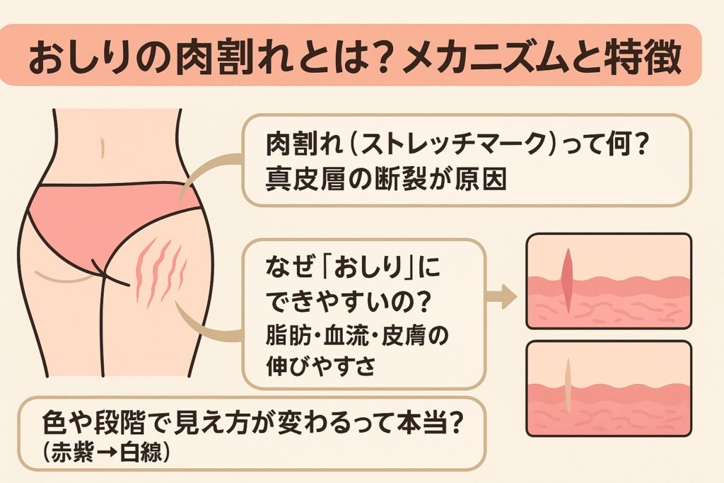 おしり 肉割れ 治し方を知りたいあなたへ。おしりにできてしまった“肉割れ(ストレッチマーク)”がなぜ起こるのか、セルフでできる保湿・マッサージ・栄養・運動による目立たせないケア、さらに美容医療の受診目安まで丁寧に解説します。