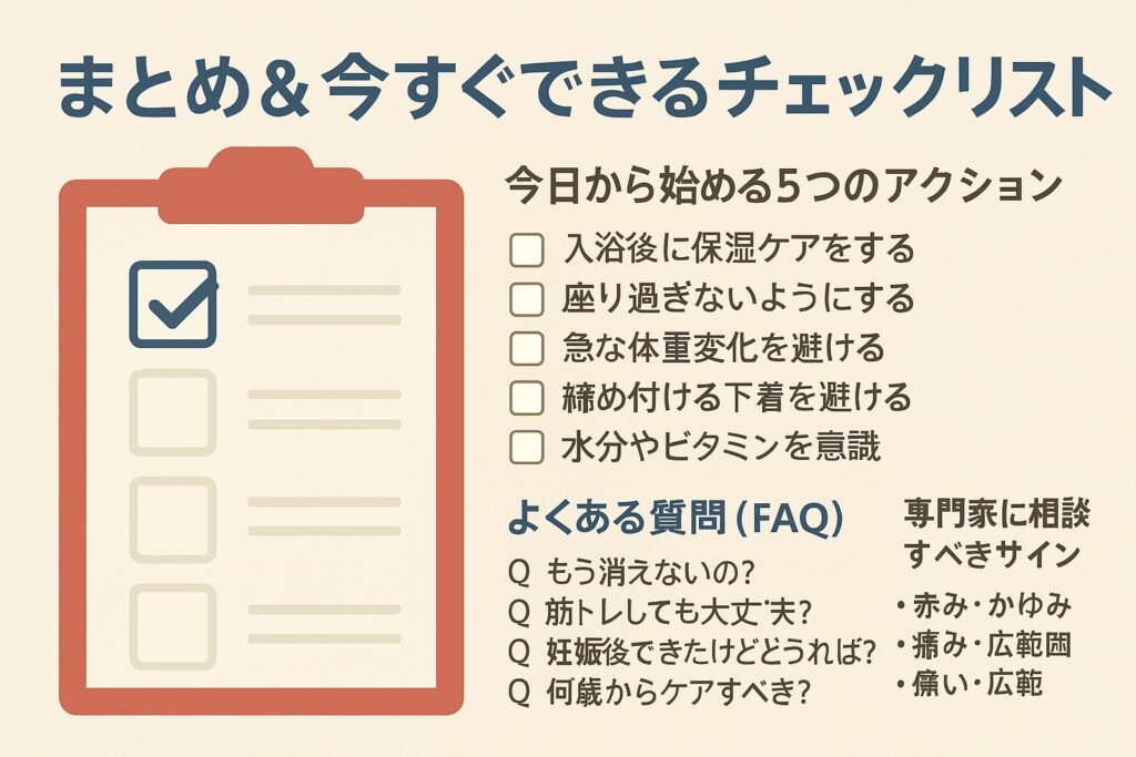 チェックリスト形式で「今日から始める5つのアクション」おしりの肉割れをすぐに完全に消すことは難しいと言われていますが、毎日の小さなケアの積み重ねが見た目の改善につながるとされています。まずは、今日からできる行動を簡単なチェックリストで整理してみましょう。