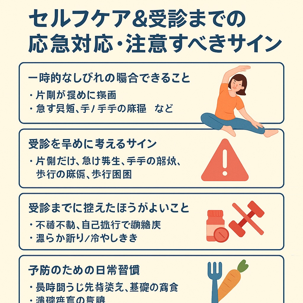 受診を早めに考えるサイン(片側だけ・急な発症・手足の麻痺・歩行困難など)
