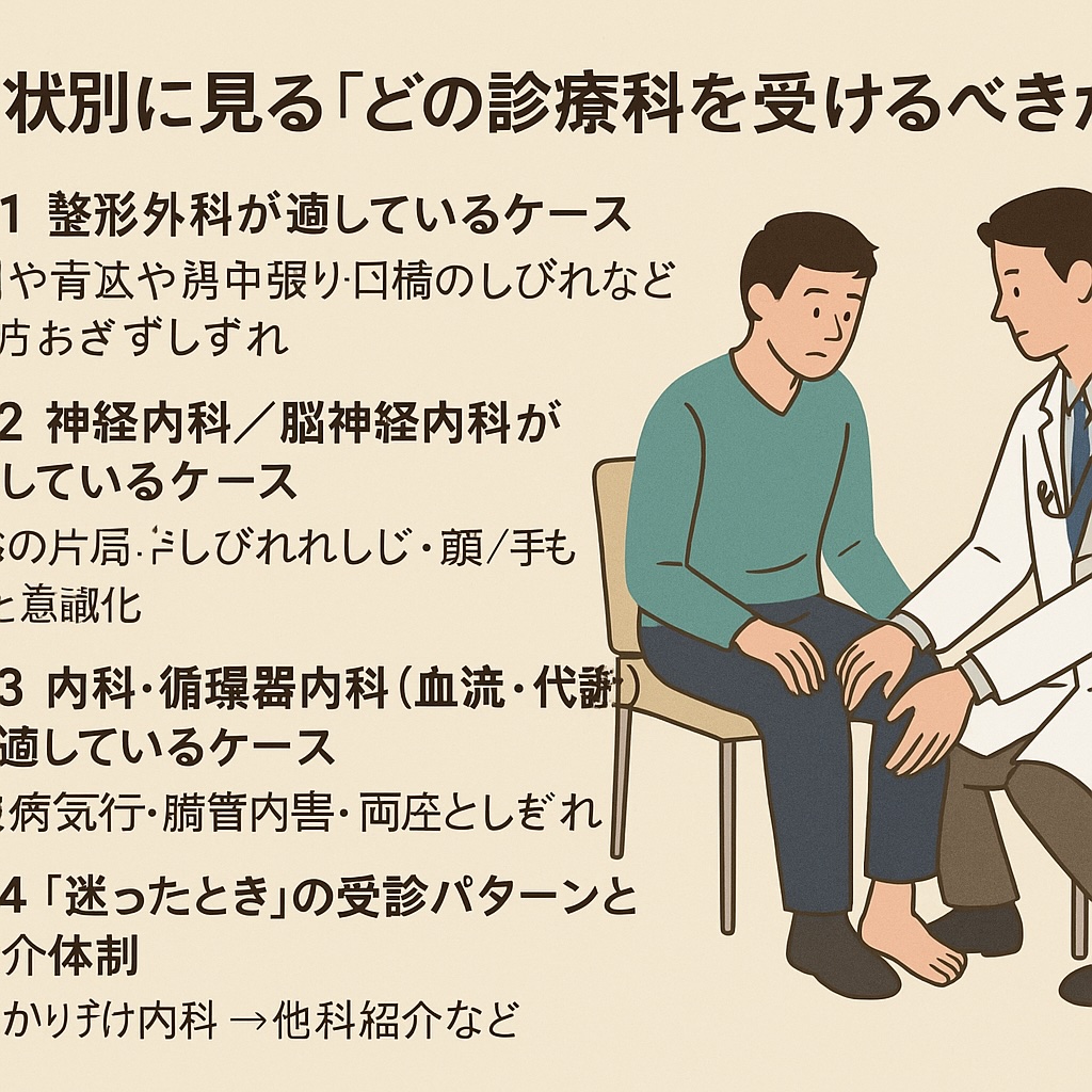「どこへ行けばいいのかわからない」ときは、まずかかりつけの内科で相談すると安心です。内科医が初期評価を行い、症状に応じて整形外科・神経内科・循環器内科など、適切な専門科へ紹介してもらえる仕組みがあります。