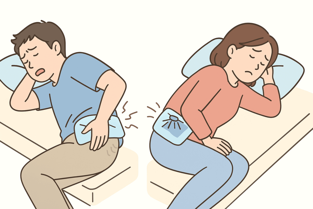 横になって楽な姿勢を探すのがポイントです。たとえば、仰向けで膝を立てる「膝立ち姿勢」や、横向きで膝を軽く曲げる「胎児のような姿勢」が比較的ラクだと言われています。