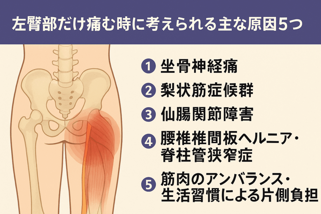 「左臀部の痛み」は一見すると軽い筋肉の張りに感じられますが、背骨や骨盤、神経など複数の要因が関わることが多いとされています。