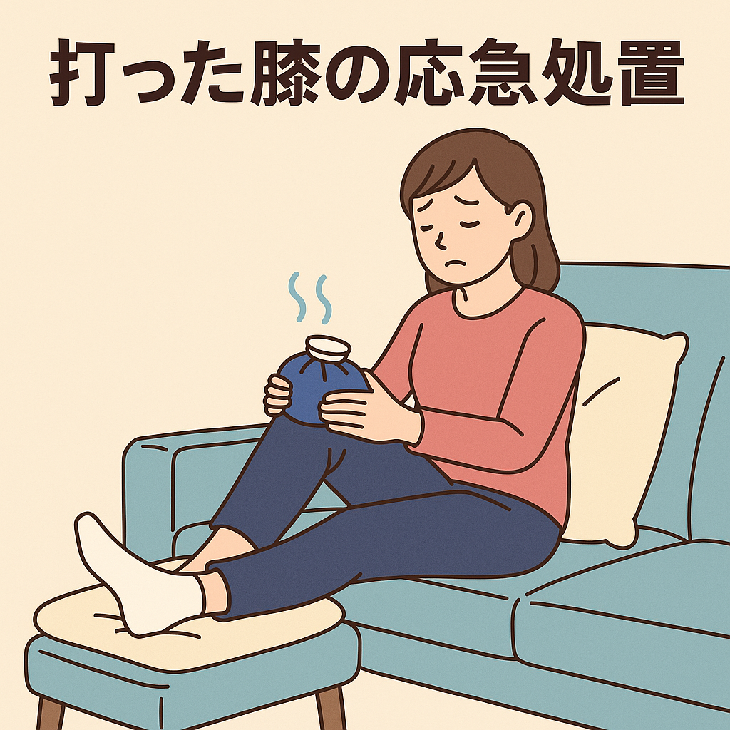 膝をぶつけた直後は、痛みや腫れに焦ってしまう方も多いですが、まずは落ち着いてRICE処置を行うことがすすめられています。