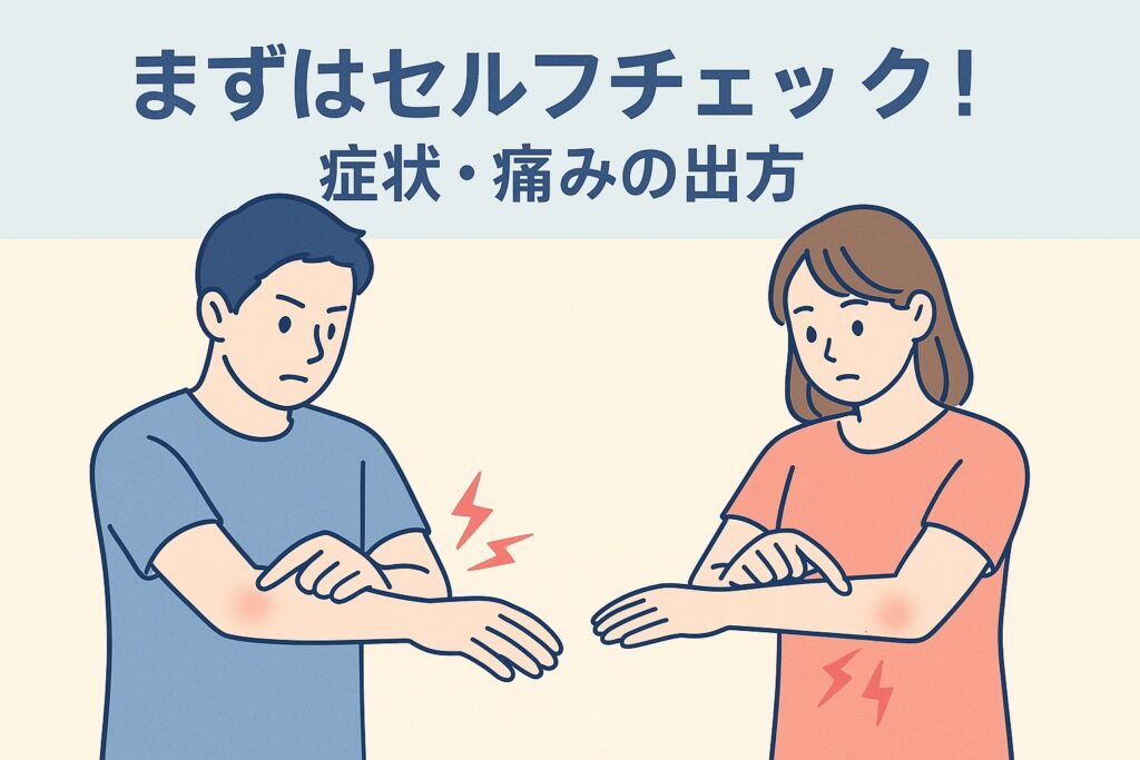 また、手首を下方向に曲げたときに肘の内側が痛む、逆に上方向へ反らせたときに外側が痛む場合も同様の傾向があります。これらのチェックは、Tarzan Web や整体院Oasisでも紹介されている基本的な確認法で、特別な道具も必要ありません(引用元:Tarzan Web、整体Oasis公式サイト)。